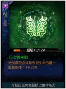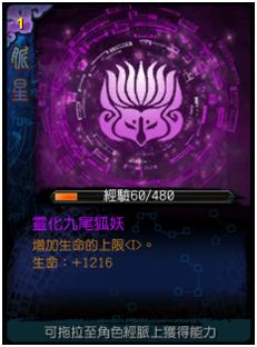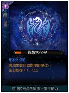 經脈欄:共有「帶脈」、「陰蹺」、「任脈」、「陰維」、「沖脈」、「陽蹺」、「督脈」、「陽維」八欄,可將脈星存放槽欄位中脈星拖拉至經脈欄欄位裝備,經脈欄位依角色等級提升陸續開放。