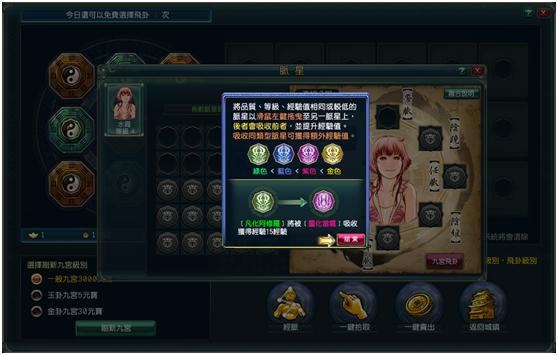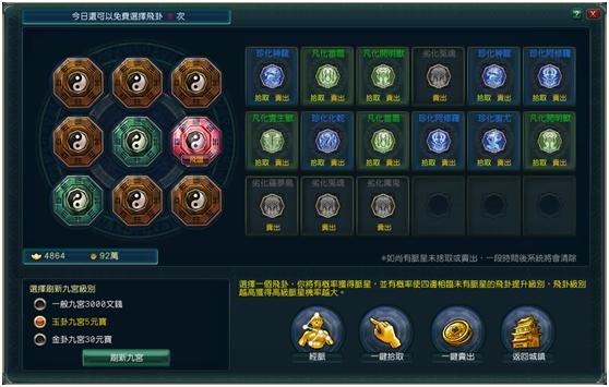 刷新九宮:分為一般刷新、玉卦刷新、金卦刷新,而玉卦和金卦刷新則是VIP才能使用,玉卦刷新後必定會出現1個玉卦,金卦刷新亦是如此。