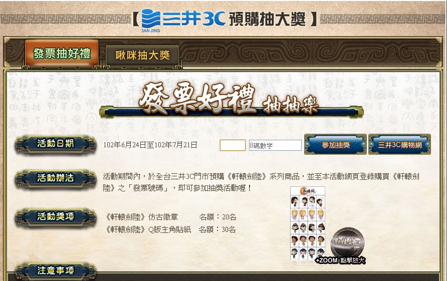 《軒轅劍陸》三井3C抽獎活動:http://activity.softstar.com.tw/SWD6/1020624/index_2.html